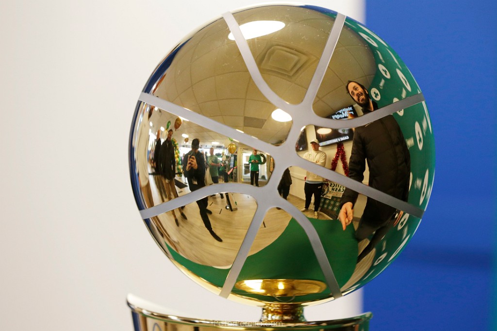 136_MUN4256 Fans are reflected on the Celtics 2024 NBA Champion trophy as they take photos with it during its stop at the Mass State Lottery office at the Industrial Park in New Bedford.
